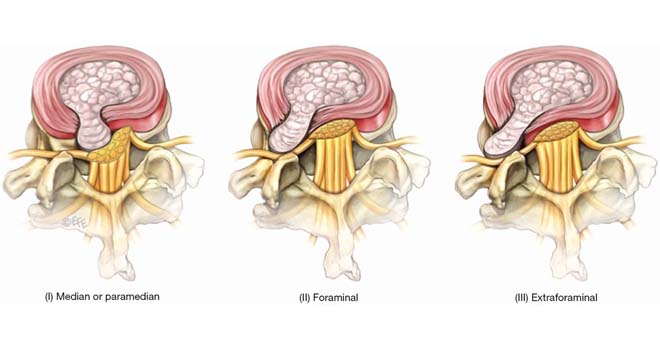 Herniated disc is a condition in which the outer fibers (annulus) of the intervertebral disc are damaged causing the soft inner material of the nucleus pulposus to rupture out of its space. A herniated disc, common in the lower back (lumbar spine) occurs when there is a tear in the outer lining of the disc (annulus fibrosus). This causes the inner jelly-like material (nucleus pulposus) to leak out and place pressure on the adjacent spinal nerve root. It is the most common cause of low back pain and pain that radiates down the leg (radiculopathy).